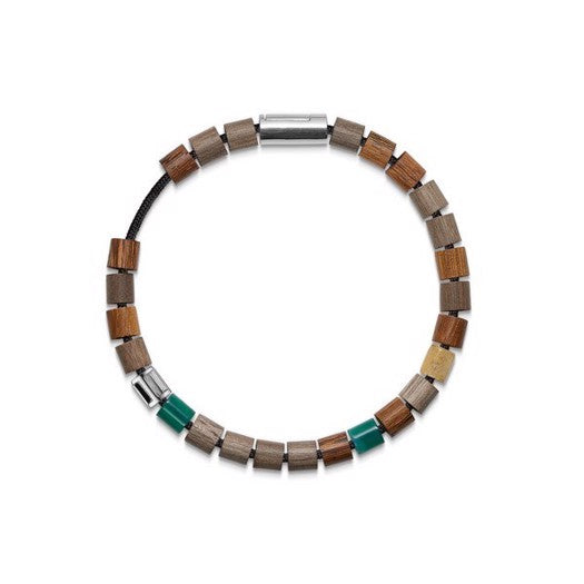 Klitmøller armbånd fra Mads Z i sort nylon med sølvlås, sølv- og træperler, grøn agat og gul jade