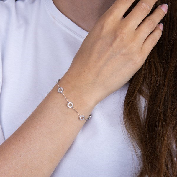 Dette stilfulde armbånd fra Joanli Nor er udført i rhodineret sterling sølv og prydes af syv delikate cirkler, hver dekoreret med sorte zirkonia-sten. De glimtende, mørke sten tilfører et spændende spil til det blanke sølv og lader armbåndet udstråle sofistikeret enkelhed. Cirklerne er elegant placeret på en fin kæde, som giver et luftigt og harmonisk udtryk på håndleddet. Med justerbar længde på 17–20 cm har du mulighed for at tilpasse smykket, så det passer perfekt til dig. Armbåndet er moderne og diskret, og det egner sig smukt til både den afslappede hverdagsstil og de mere festlige anledninger. Brug det alene for et minimalistisk look, eller kombiner det med andre Joanli Nor smykker for en fuldendt, personlig stil. ANNANOR armbåndet taler især til den stilbevidste kvinde, der elsker feminine former med et unikt tvist – og som gerne vil sætte prikken over i’et på sit outfit.