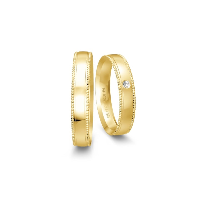 Disse vielsesringe fra Breuning lader klassisk finesse smelte sammen med moderne linjer. Her får du guldringe med en smuk blank overflade og en diskret graveret linje, der rammer designet ind. Langs kanten pryder små fine kugler, der skaber et raffineret og eksklusivt touch. Dameringen er særligt udvalgt med en funklende diamant på 0,025 carat placeret mellem linjerne, hvilket tilfører et strejf af romantik og blid glans. Med en bredde på 4 mm og en let rundet profil, føles ringene komfortable – ideelle både til fest og hverdag. Breuning kombinerer klassisk guldsmedehåndværk med stilren fornemmelse for nutidigt design, så I får et smykke, der kan følge jer hele livet.
