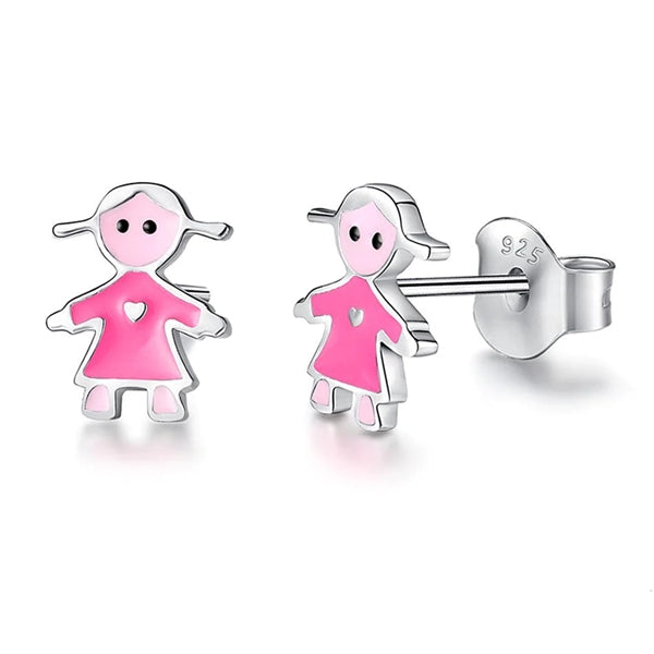 ByBirch børneøreringe i sølv med lyserød emalje og pige motiv