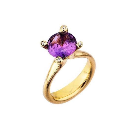 Den ekstravagante cocktail ring er udført i 14 karat guld og prydes af en stor, intens lilla ametyst, som graciøst bæres af fire elegante grabber. Hver grabbe er besat med en klar diamant på 0,01 ct., i alt fire funklende diamanter, der indrammer stenen med luksuriøs glans. Ringen udstråler eksklusivitet og passer både til den stilbevidste kvinde, der ønsker at pynte sig til hverdagens glæder, og til dig, der elsker at gøre lidt ekstra ud af det til festlige anledninger. Det klassiske design med moderne twist gør ringen både tidløs og modig, og den kan blive et centralt element i din smykkegarderobe i mange år frem.