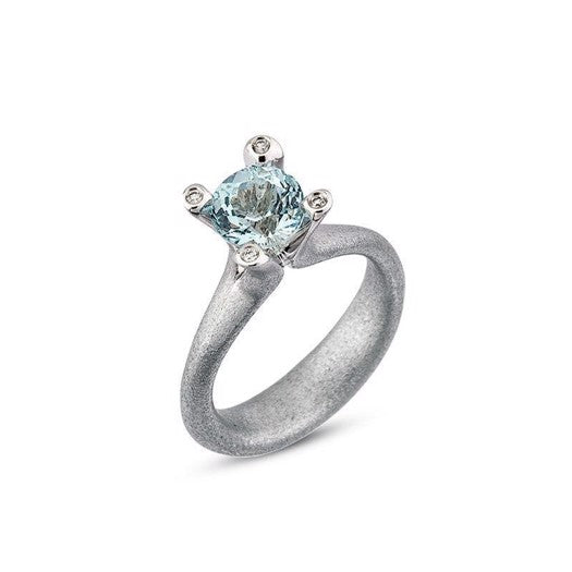 Cocktailringen fra Nuran er smukt udført i 14 karat hvidguld med en strålende, lys blå topas placeret centralt – elegant fastholdt af fire grabber. På hver grabbe glimter en klar diamant på 0,01 ct., hvilket understreger ringens eksklusive udtryk. Kombinationen af den kølige blå farve og det blanke hvidguld gør ringen både sofistikeret og betagende. Vælg selv, om du foretrækker den med blank eller rustik overflade, så du får et udtryk, der matcher din personlige stil. Det tidløse design og de fine detaljer gør ringen ideel til fejringer, middage og særlige øjeblikke – men den kan også styles til mere afslappede looks, hvis du ønsker et feminint og opsigtsvækkende præg.