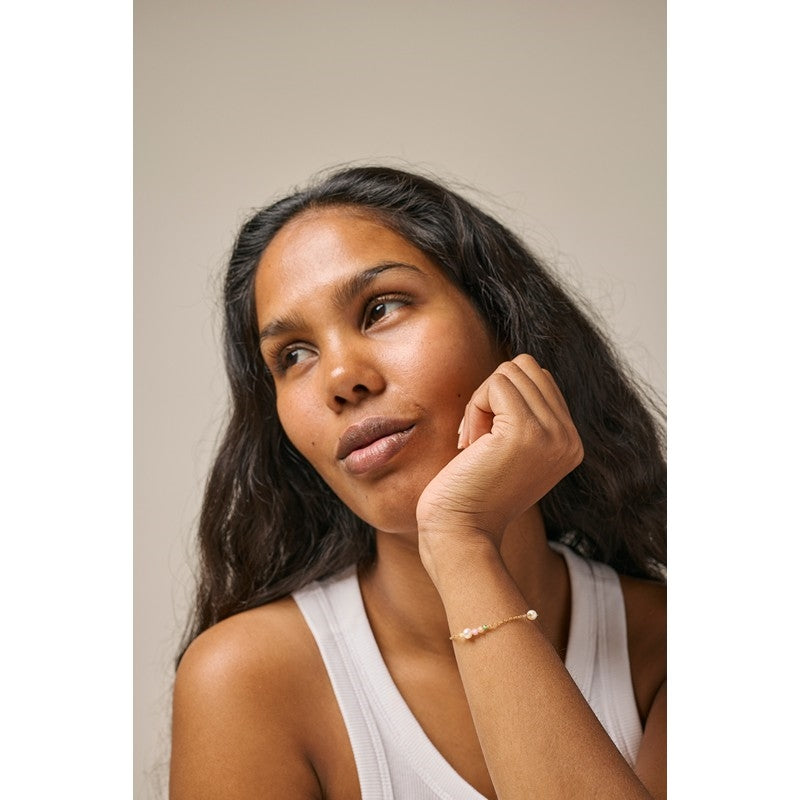 Smykket er fremstillet i 18 karat forgyldt sølv, hvilket giver et varmt og luksuriøst udtryk. Det er udsmykket med fine ferskvandsperler, lette lyserøde og grønne sten, som tilsammen skaber en harmonisk og unik farvepalet. Armbåndet måler 15–18 cm og kan nemt justeres, så det passer perfekt til dit håndled. Enamel Copenhagen er kendt for deres sans for at kombinere æstetik og funktionalitet, og det ses tydeligt i dette designede armbånd, der både egner sig til hverdag og særlige lejligheder. Den elegante stil gør det oplagt at bære alene for et enkelt touch, eller kombinere med andre armbånd for et mere personligt udtryk.