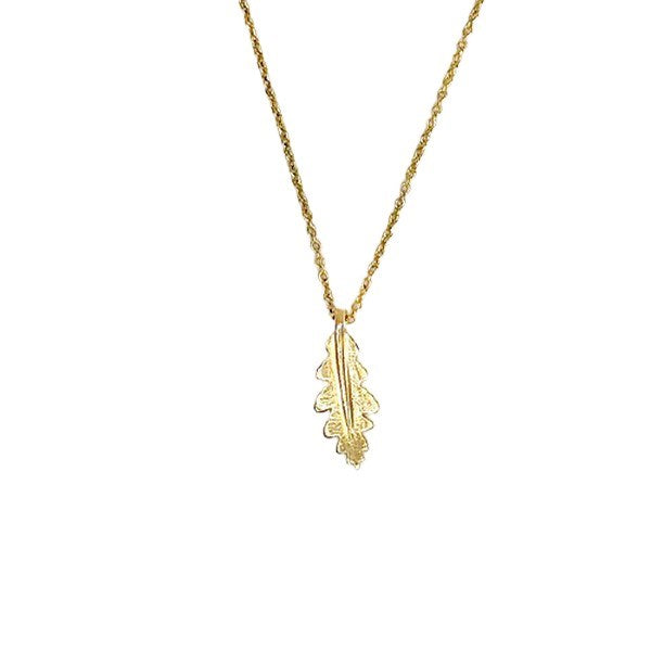 Der findes denne smukke halskæde med det fine bladvedhæng i én variant, som inkluderer vedhæng i 8 kt. guld, zirkon-sten og en forgyldt kæde med fleksibel længde. Smykket leveres samlet, så du straks kan tage det i brug.