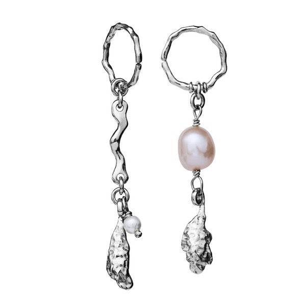 Lyric øreringene fra Maanesten er skabt i skinnende sterlingsølv og prydet med smukke, organiske ferskvandsperler. Det særlige ved dette design er det asymmetriske udtryk – én creol har en stor perle og den anden en mindre, så længden varierer let og skaber en eksotisk og iøjnefaldende balance. Vriddesignet uden synlige hængsler giver et stilrent look, som understreger øreringenes lette, moderne natur. Låsen åbnes ved forsigtigt at vride ringen til siden, så du får et design, der er enkelt, men alligevel fuld af attitude.