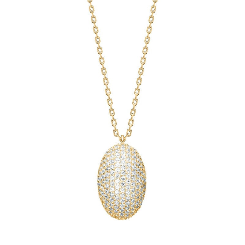 Her får du en stor halskæde i 18 karat forgyldt 925 sterlingsølv, kendetegnet ved det markante vedhæng pavébesat med gnistrende hvide zirkonia. Smykket stråler med en glamourøs energi, og de mange sten giver en vidunderlig effekt, når de fanger lyset fra alle vinkler. Den justerbare kæde på 42–45 cm gør det nemt at tilpasse smykket både til hverdagens enkle look og aftenens elegante påklædning. REBECCANOR kollektionen fra Joanli Nor hylder det feminine univers, hvor styrke og ynde kombineres i et tidløst smykke, der passer til kvinder i alle aldre.