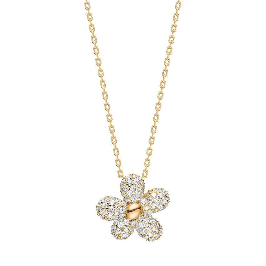 Halskæden tilbydes i ét design i forgyldt sølv med blomstervedhæng og hvide zirkonia. Længden kan justeres fra 42 til 45 cm, så du kan tilpasse den efter dit outfit.