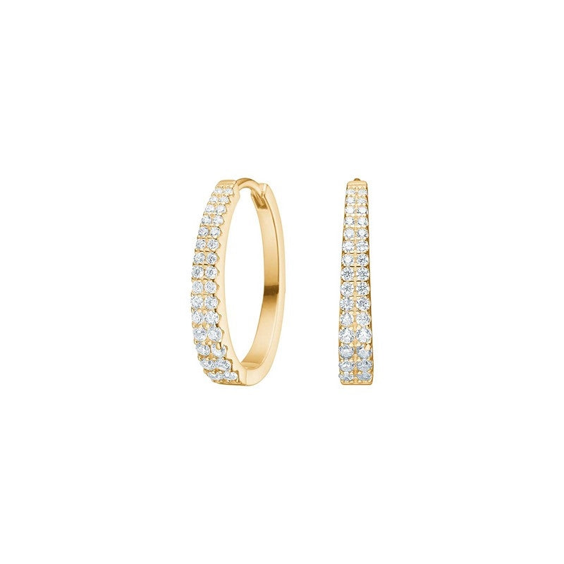 RUNANOR creolerne er udført i forgyldt sterlingsølv og prydet med to rækker smukke, hvide zirkonia-sten på forsiden, som fanger lyset og får dig til at stråle både til hverdag og fest. Designet balancerer mellem det elegante og det klassiske, så øreringene passer til alle anledninger – fra et simpelt hverdagsoutfit til et fuldendt look til festlige begivenheder. RUNANOR kollektionen fra Joanli Nor hylder diskret luksus og et feminint udtryk, hvor de glimrende sten engagerer alles opmærksomhed.