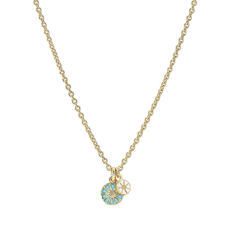 Marguerit halskæde i 24 kt forgyldt sølv med blå og hvid blomst 45–48 cm – Lund Copenhagen
