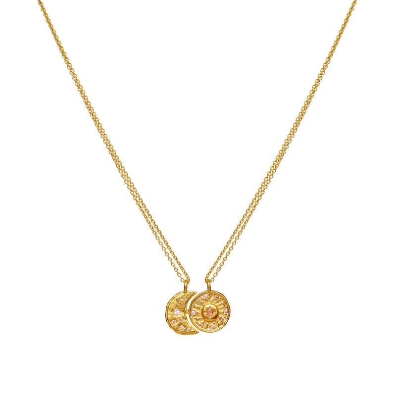 Du modtager to identiske halskæder i sættet, som begge har det smukke sol- og månevedhæng, der kan knækkes i to. Sættet findes i denne ene elegante variant med forgyldt sterlingsølv og justerbar længde – perfekt til dig, der ønsker et markant og hjerteligt smykke.