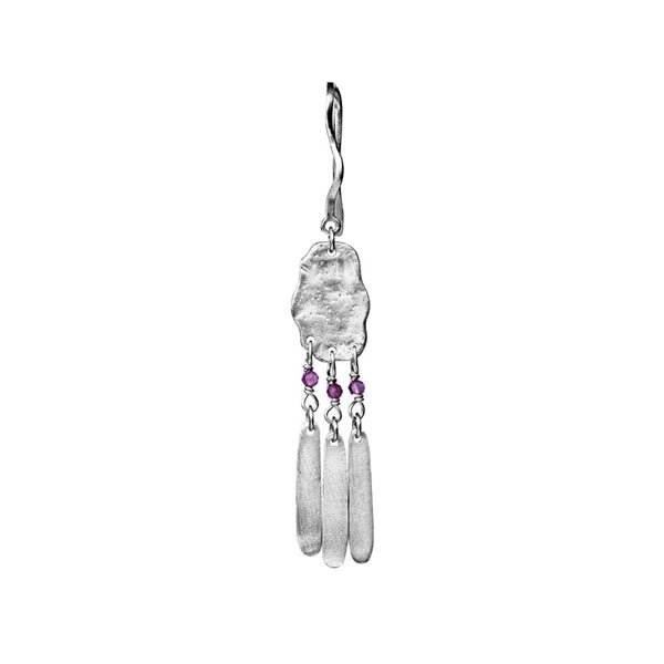 Øreringen er fremstillet i skinnende sølv og prydes af tre smukke ametyster, der indfanges elegant mellem de hamrede sølvelementer. De lilla sten tilfører øreringen et strejf af mystik og farve, som komplementerer både hverdagens stil og festens glamour. Evalina passer perfekt til dig, der elsker et finurligt, men klassisk look, og som ønsker at udtrykke personlighed gennem fine detaljer. Brug øreringen alene for et diskret udtryk, eller kombiner den med andre øreringe fra Maanesten for et moderne og legende mix.