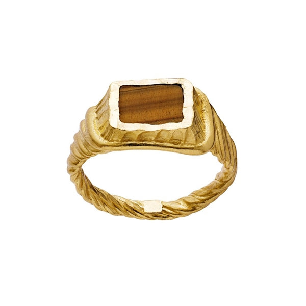 Vælg denne signetring i forgyldt sølv med tigerøje, og lad den indgå som et iøjnefaldende element i din smykkesamling. Ringen findes i “Default Title”-varianten – kontakt gerne Smykkecenter, hvis du ønsker at vide mere om størrelsesmuligheder eller kollektionens andre smykker.