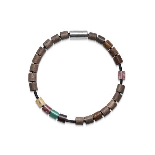 Black Sun armbåndet fra Mads Z kombinerer sort nylonsnor med sølvlås, hvilket skaber et stilfuldt og samtidig afslappet udtryk. De smukke perler i cherry quartz, grøn agat, gul jade og driftwood giver armbåndet et eksklusivt og farverigt look. Armbåndet passer perfekt til både daglige outfits og særlige lejligheder, og materialernes naturlige nuancer gør det nemt at kombinere med andet tilbehør. Dette design udstråler individualitet og charme – et smykke, der følger dig fra morgen til aften.