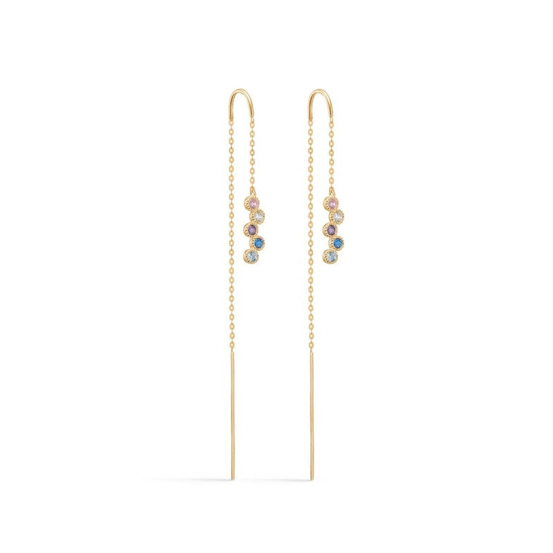 Disse stilfulde ørehængere er udført i strålende 8 karat guld, og de mange farvede zirkoner giver et moderne og levende udtryk. Designet er både iøjnefaldende og raffineret, hvilket gør øreringene perfekte til dig, der ønsker et smykke ud over det sædvanlige. Med en længde på 30 mm har de en let svævende kædeeffekt, som bevæger sig smukt, når du bærer dem. Uanset om du bruger dem alene eller kombinerer dem med andre øreringe, får du et alsidigt smykke, der både passer til hverdag og fest.