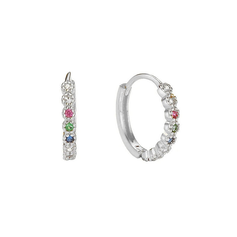 Katja øreringene fra MerlePerle fås i denne udgave i sterlingsølv med regnbue zirkonia. Kombinationen af sølv og farvede sten gør dem alsidige og lette at matche med forskellige styles og lejligheder.