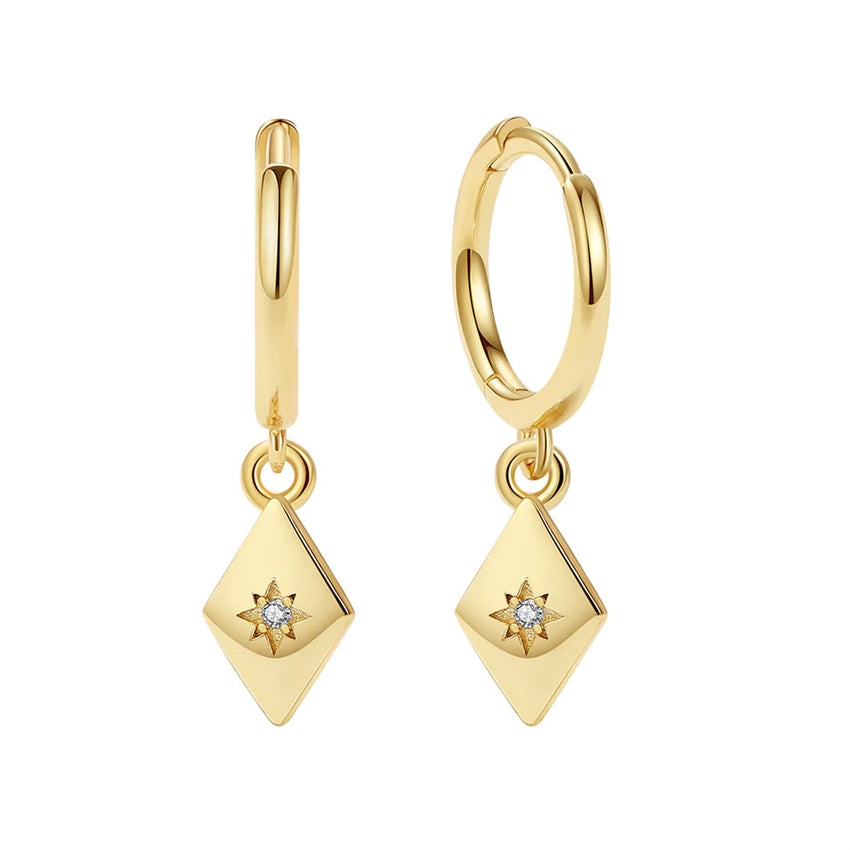 Fia creolerne tilbydes i denne flotte variant med forgyldt sølv, rhombevedhæng og funklende zirkonia, så du er sikret et alsidigt smykke, der matcher enhver anledning.