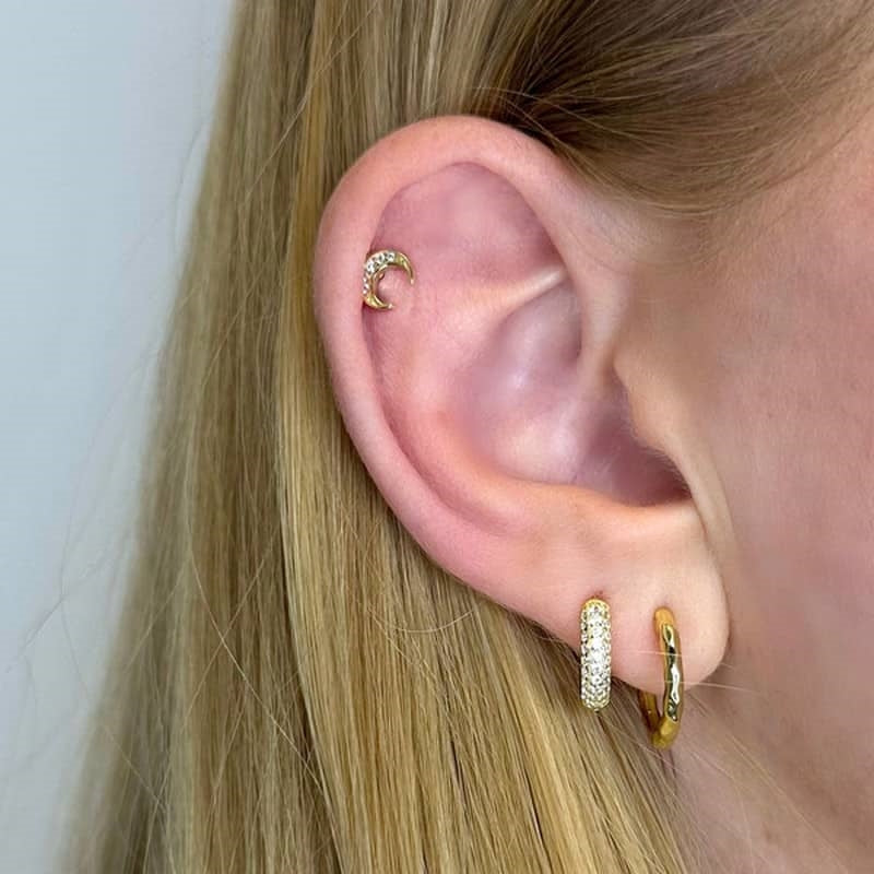 Alison ørestikker er forarbejdet i 18 karat forgyldt 925 sterlingsølv, hvilket tilfører en varm og luksuriøs finish. Designet udgøres af en fin halvmåne dækket af funklende hvide zirkonia-sten, der indfanger lyset og reflekterer det smukt ved enhver bevægelse. De klare sten og det gyldne sølv skaber en sofistikeret kombination, der gør ørestikkerne velegnede både til hverdag og særlige lejligheder. Ørestikkerne er diskrete, men tiltrækker stadig opmærksomhed med deres personlige og moderne præg. Uanset om du bærer dem alene for et enkelt statement, eller kombinerer dem med andre smykker, fremhæver de din unikke stil. De behagelige mål og lette design gør dem ideelle til daglig brug, uden at gå på kompromis med elegance.