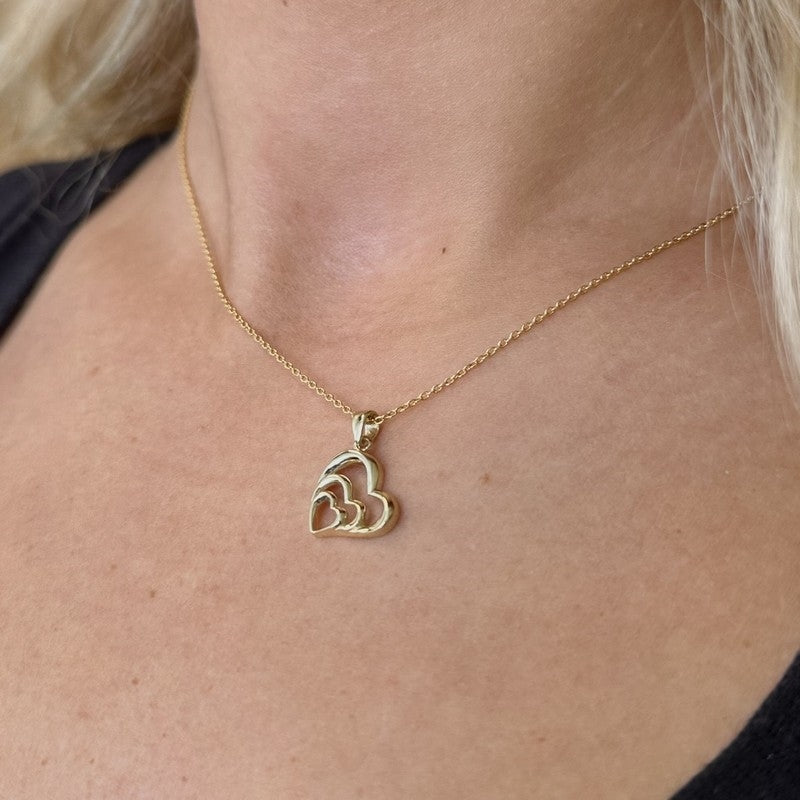 Siersbøl har hér skabt et vedhæng i 8 karat guld, hvor tre hjerter i forskellige størrelser elegant ligger placeret indeni hinanden. Det delikate vedhæng hænger på en halskæde i forgyldt sølv, der måler 41–44 cm. Smykket emmer af klassisk stil og passer perfekt til alle anledninger – hvad enten det er til hverdag eller fest. Den gyldne glød rammer et blødt og feminint udtryk, som vil klæde enhver kvinde, der værdsætter et minimalistisk, men alligevel iøjnefaldende design.