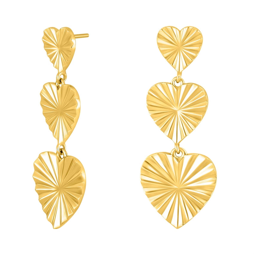 Denne ørering byder på et raffineret udtryk, hvor elegante linjer smelter sammen med legende detaljer. Øreringene er smukt udført i 18 karat forgyldt 925 sterlingsølv og prydet med tre hjerter i forskellige størrelser, der tilfører et unikt spil og bevægelse til øret. Måler 15 x 40 mm, hvilket giver et iøjnefaldende og samtidig harmonisk udtryk. Designet er klassisk og enkelt med et grafisk præg, der gør dem lette at style til både hverdag og fest. Perfekte til den moderne kvinde, der sætter pris på smykker med personlighed og tidløs elegance. Nordahl Andersen har endnu engang formået at skabe et smykke, der både skiller sig ud og passer ind i enhver stil.