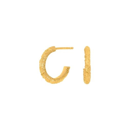 Nordahl Jewellery har skabt disse halvcreoler i forgyldt sølv med en flot banket overflade, der giver et spil af lys og et unikt udtryk. Enkeltheden i designet gør dem nemme at style – hvad enten du bruger dem til hverdag eller lader dem skinne ved festlige lejligheder. Den klassiske form og de moderne detaljer passer til alle aldre og enhver stil, og den gyldne glød giver et elegant, feminint præg til dit smykkeskrin.
