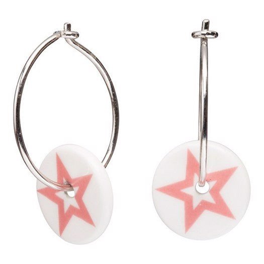 Disse porcelæn creoler fås i den viste variant, hvor det fine samspil mellem den hvide baggrund og rosa stjerne skaber et iøjnefaldende smykke. Perfekt både som gaveidé og som et nyt medlem i din egen smykkesamling.