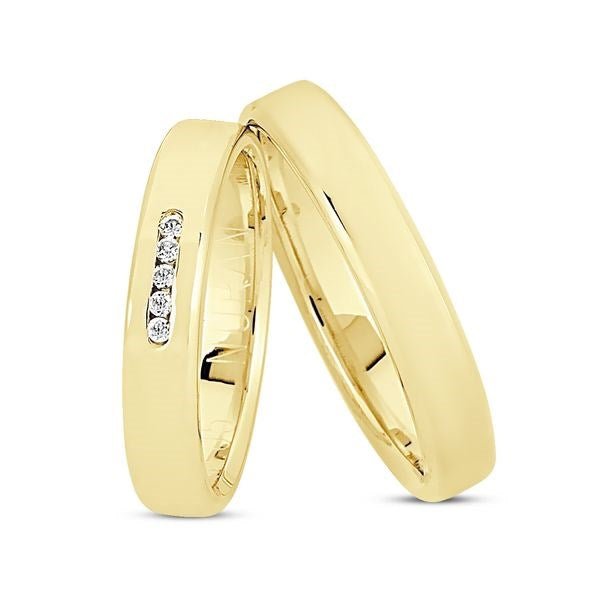 Denne vielsesringsæt fra Nuran fremstår i blankt guld med raffineret og harmonisk udtryk. Dameringen stråler diskret med fem indfattede diamanter – i alt 0,05 ct. – placeret i den fineste kanalfatning, som giver ekstra glans og ægte luksus uden at virke prangende. Siden 1998 har Nuran været synonym med kompromisløs kvalitet og fine detaljer, og det mærkes i hver eneste linje og overflade på disse vielsesringe. Uanset om det er til bryllupsdagen eller hverdagen, er de det perfekte valg for både ham og hende, der ønsker en stilfuld og meningsfuld påmindelse om deres bånd.