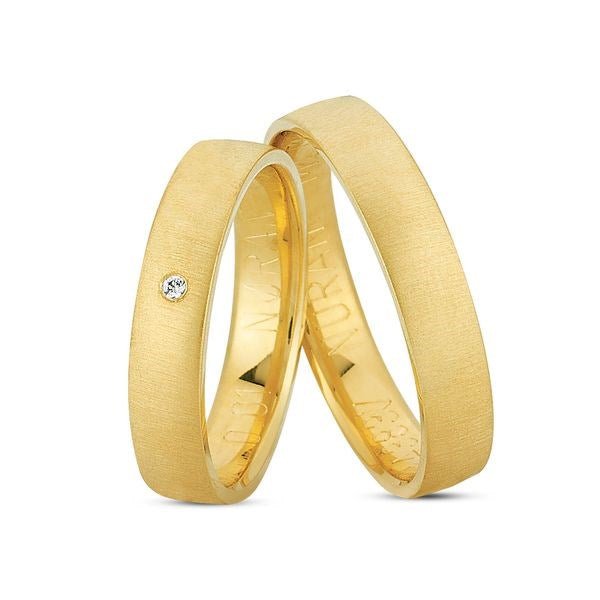 Vielsesringene fra NURAN kommer i denne elegante udgave i 14 kt. guld med én funklende diamant på dameringen. Vælg disse ringe for at markere jeres unikke kærlighedshistorie med et kvalitetsstempel fra en anerkendt dansk guldsmed. Varianten har en klassisk formfaktor, der passer til de fleste stilarter og lader materialet og den fine finish tale for sig selv.