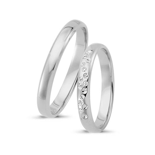 Disse klassiske vielsesringe fra Nuran er udført i eksklusivt 14 karat hvidguld, hvilket giver et strålende, stilfuldt udtryk, der aldrig går af mode. På dameringen kaster 5 diamanter, smukt placeret som et romantisk stjernedrys, et let og glitrende spil, der elegant symboliserer jeres kærlighed. Nuran har gennem mange år været kendt for præcision, kvalitet og et stærkt dansk design – og netop derfor er deres vielsesringe et sikkert valg til den store dag. Uanset om I søger et enkelt og klassisk look eller ønsker et strejf af luksus, passer disse ringe perfekt til det moderne par, der ønsker kvalitet og karakter. Den diskrete stil gør dem ideelle til både hverdag og festlige anledninger, og deres tidløse design vil glæde jer år efter år.