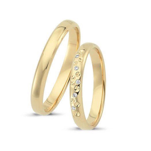 Nuran vielsesringe i 14 kt guld er for jer, der værdsætter tidløst design og kvalitet i særklasse. Her får I ringe, der udstråler eksklusivitet uden at være prangende, med dameringen forskønnet af fem funklende diamanter på i alt 0,025ct, placeret som et subtilt stjernedrys. Nuran er kendt for deres slidstærke og smukke ringe, der egner sig både til dagligdagen og de største øjeblikke. Den varme gyldne glød fra 14 kt guld fremhæver brillanternes særlige spil med lyset, så ringen vil skinne smukt, år efter år. Designet er ideelt til det stilbevidste par, der ønsker at markere deres kærlighed med et unikt og meningsfuldt smykke.
