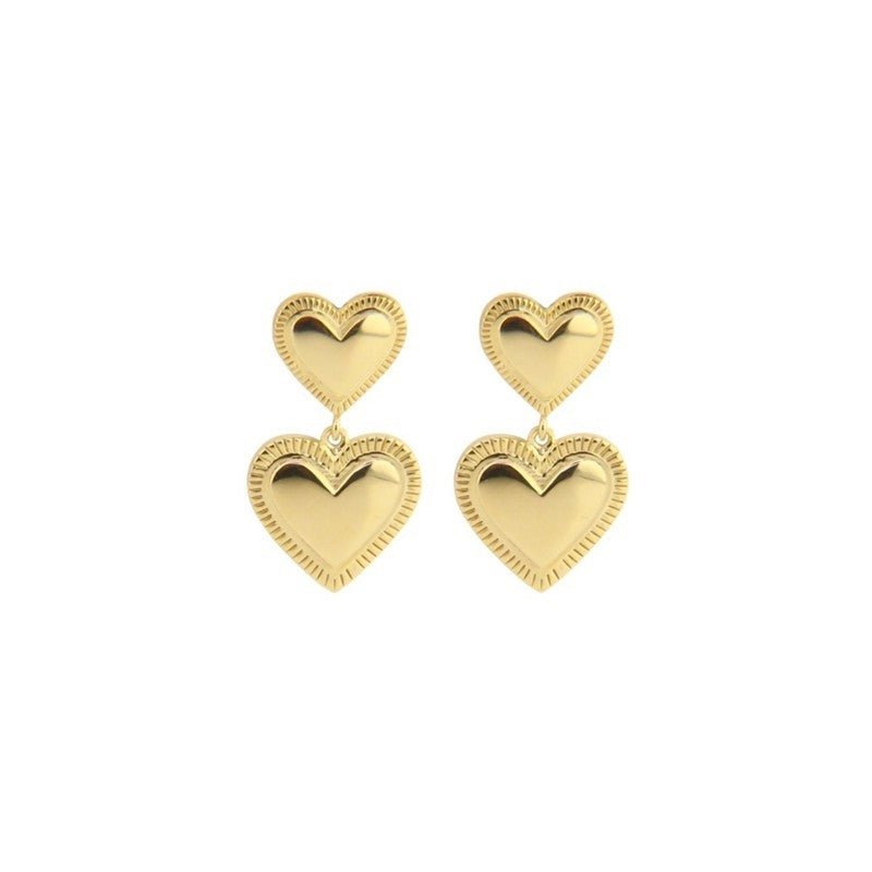 Disse smukke øreringe fra Jeberg Jewellery er fremstillet i 24 mm lange hjerteformede vedhæng, udført i 18 karat forgyldt 925 sterlingsølv. Designet med dobbelt hjerte giver et elegant, feminint og unikt look, der let kan tage dig fra hverdag til fest. De voluminøse, men lette øreringe kombinerer et nutidigt formsprog med en tidløs romantik og passer til både unge piger og stilbevidste kvinder, der ønsker et smykke med varme og karakter.