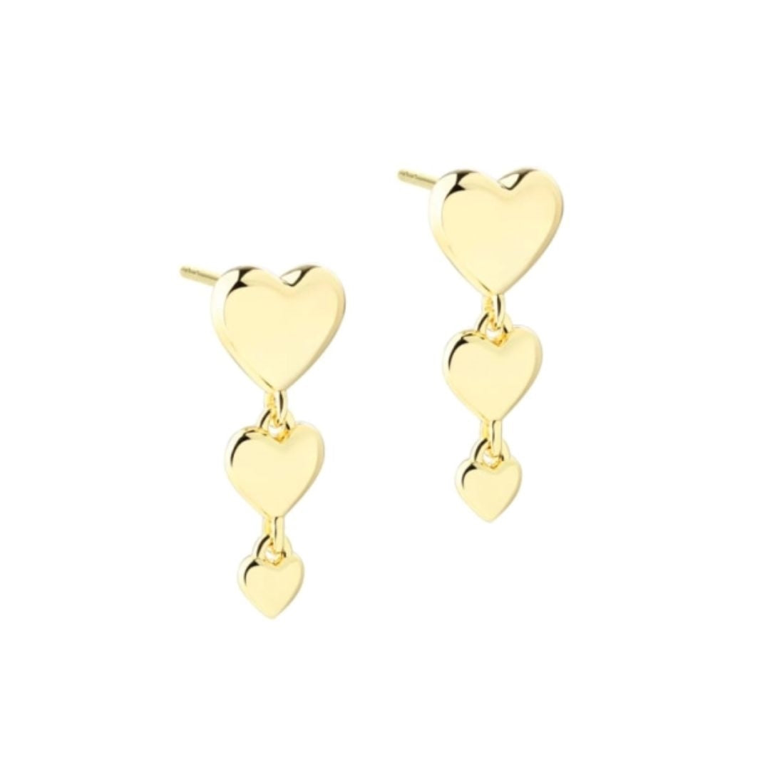 Disse stilfulde øreringe fra Aqua Dulce er udført i 925 sterlingsølv og belagt med 14 karat guld. Det raffinerede design består af tre blankpolerede hjerter i forskellig størrelse, der smukt forenes i et feminint og livligt udtryk. Denne sammensætning af hjerter tilfører bevægelse og spil i lyset, så ørenringene kaster et varmt og fortryllende skær omkring dig. Den gyldne overflade har en klassisk og tidløs kvalitet samtidig med, at den rammer tidens trend med et moderne twist.
