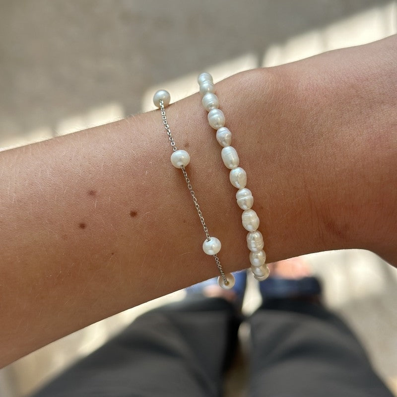 Armbåndet findes i denne skønne udgave med ovale ferskvandsperler og sølv. Det fås med justerbar længde, så det passer til de fleste størrelser.