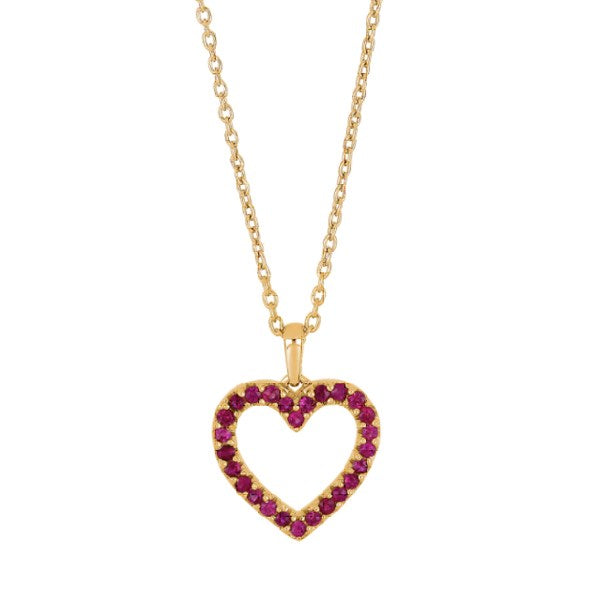 Siersbøl hjertevedhæng i 14 kt guld med rubiner og forgyldt sølvkæde 42+3 cm