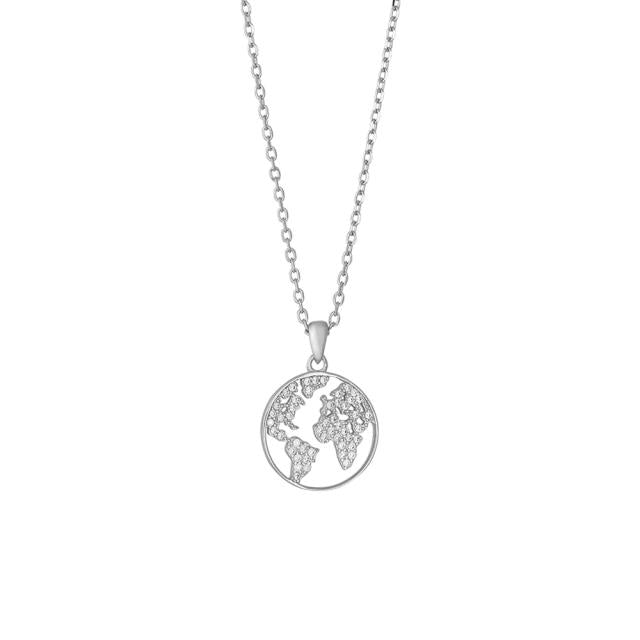 JoanliNor EttaNor halskæde i sølv med zirkonia og world vedhæng 15 mm 42+3 cm