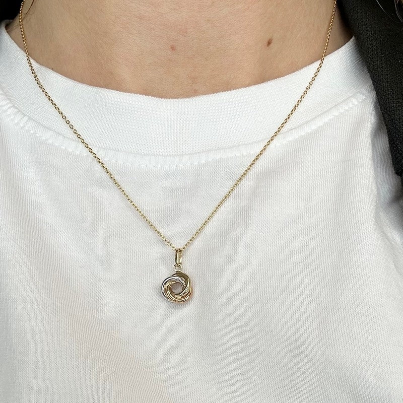 Dette skønne vedhæng er udført i 8 karat guld og forener tre fine farvetoner i én elegant knude, hvilket skaber et unikt og tidløst udtryk. Den medfølgende kæde er i forgyldt sølv og har en justerbar længde på 42–45 cm, så du nemt kan tilpasse smykket til netop din stil. Vedhænget er dekoreret med funklende kubiske zirkonia, som fanger lyset smukt og tilfører et ekstra strejf af glamour. Smykket passer perfekt til både hverdag og festlige lejligheder – og det feminine design gør det ideelt til kvinder i alle aldre, der sætter pris på klassisk, men alligevel iøjnefaldende stil.