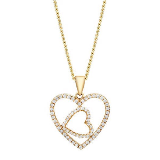 Det smukke vedhæng består af to hjerter – det ene elegant placeret inden i det andet – og begge er prydet med et væld af klare kubiske zirkonia, som giver et fortryllende spil i lyset. Det enkle, grafiske udtryk gør designet tidløst og alsidigt, så det let passer til både hverdag og fest. Smykket balancerer det romantiske og det moderne på fineste vis og egner sig både som kærlig gave og som personlig forkælelse. Den medfølgende kæde i forgyldt sølv tilfører et ekstra lag af eksklusivitet og gør vedhænget komplet, klar til at bæres alene eller sammen med dine andre favoritter.
