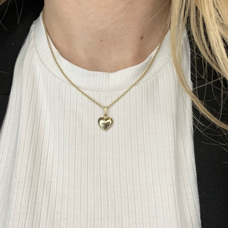 Vedhænget er udført i eksklusivt 14 karat guld, hvilket ikke blot giver det en varm og luksuriøs glød, men også sikrer lang holdbarhed. Det hjerteformede vedhæng har en skinnende, blank overflade, som fanger lyset smukt og fremhæver guldfinisheren. Med sine fine mål på 9,8 mm i højden og 10,9 mm i bredden får du et diskret og elegant smykke, der klæder både hverdagens enkle outfits og de mere festlige anledninger. Hjertevedhænget kan bæres alene i en kæde for et rent udtryk eller mikses med andre vedhæng for at skabe din egen personlige stil.