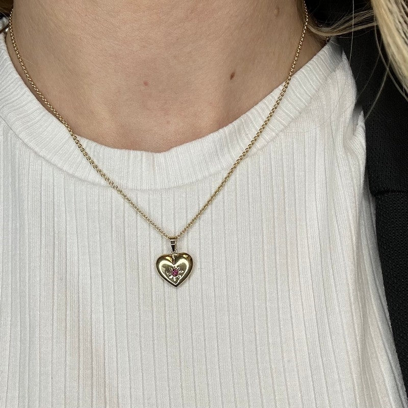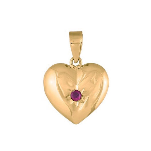 Siersbøl hjertevedhæng i 8 karat guld med rød syntetisk rubin