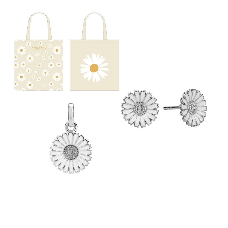Marguerit smykkesæt fra Aagaard i sterlingsølv med hvid emalje – øreringe Ø10 mm og vedhæng Ø15 mm