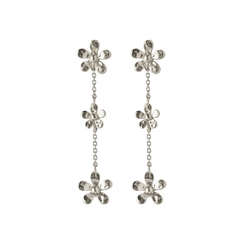 Wild Poppy øreringene fra Pernille Corydon fås i denne sølvvariant med dekorative blomster på kæde. Kombinér dem gerne med andre smykker fra Golden Fields kollektionen for et fuldendt, harmonisk look.