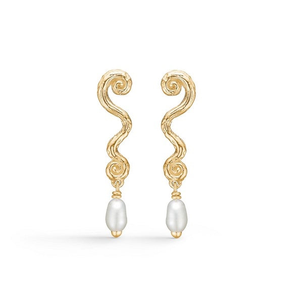 Disse øreringe fra Studio Z er udført i kvalitets 925 sterlingsølv, smukt forgyldt med 18 karat guld. De charmerende, bølgede former smyger sig elegant omkring øreflippen og fremhæves smukt af de blanke, hvide dråbeperler. Det enkle skandinaviske formsprog gør dem alsidige – perfekte til alt fra hverdagens afslappede look til fine lejligheder, hvor du ønsker et let og stilfuldt udtryk. Studio Z lykkes igen med at skabe et moderne smykke, du aldrig bliver træt af, designet af Mads Z og med naturen som sit hjerte.