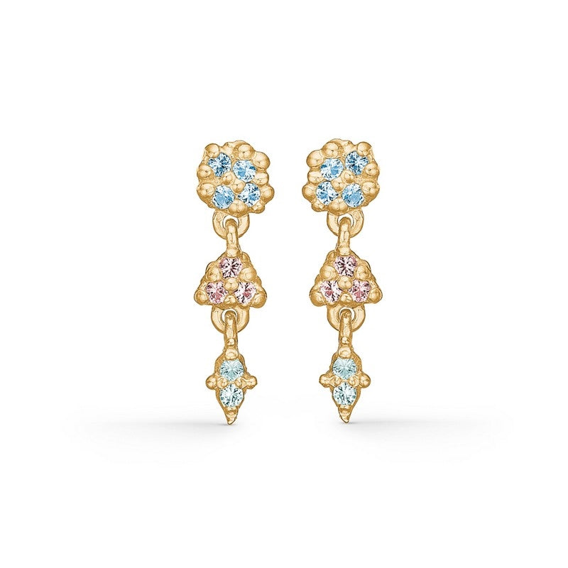 Cluster øreringe fra Studio Z i 18 karat forgyldt sølv med blå, grøn og rosa zirkonia