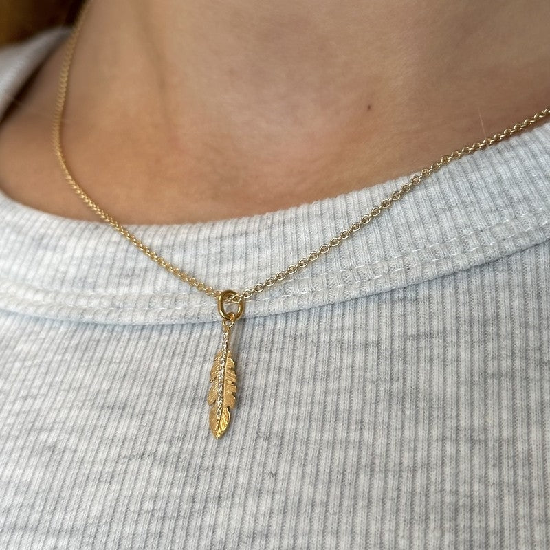 Aagaard har designet dette smukke vedhæng i 8 karat guld og prydet det med en række klare zirkonia, der følger fjerens midterlinje og fanger lyset med et elegant spil. De delikate detaljer får fjeren til at fremstå livlig og unik, og den klassiske forgyldte sølvkæde på 45 cm tilføjer et moderne touch. Dette smykke fra Aagaard er en kombination af tidløs charme og nutidigt design – ideelt til både hverdag og festlige lejligheder. Med sit lette og feminine udtryk passer det perfekt til kvinder i alle aldre, der værdsætter kvalitet og smukt håndværk.