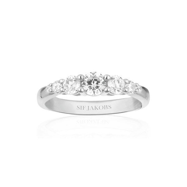 Belluno ringen fra Sif Jakobs forener det klareste 925 sterlingsølv med funklende hvide zirkoner, håndsat i forskellige størrelser for et elegant og eksklusivt udtryk. Den 4,5 mm brede ring glitrer om fingeren med sit raffinerede facetterede look, og rhodiumbelægningen sikrer et ekstraordinært shine samt lang holdbarhed. Ringen kan bæres alene som et statement piece eller kombineres med andre ringe for et personligt præg. Den passer perfekt til både hverdag og fest og er et oplagt valg til dig, der værdsætter klassisk, moderne design.