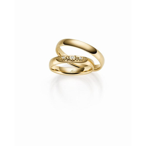 Disse vielsesringe fra Gerstner er et oplagt valg for par, der ønsker en klassisk og elegant ring med et personligt præg. Ringene er udført i enten 9-karat eller 14-karat guld og har en smuk, blankpoleret overflade, som fremhæver materialets varme glød. Med deres afrundede profil ligger de behageligt om fingeren – perfekte til både hverdagsbrug og store begivenheder. Dameringen udmærker sig med tre diskret indfattede diamanter på i alt 0,02 carat; de briljantslebne sten danner et fint, glimtende mønster, der tilfører et eksklusivt og feminint touch uden at tage fokus fra ringens rene linjer. Dermed får I smykker, der både er stilfulde og komfortable – ideelle for dem, der ønsker en romantisk og varig markering af deres forhold.