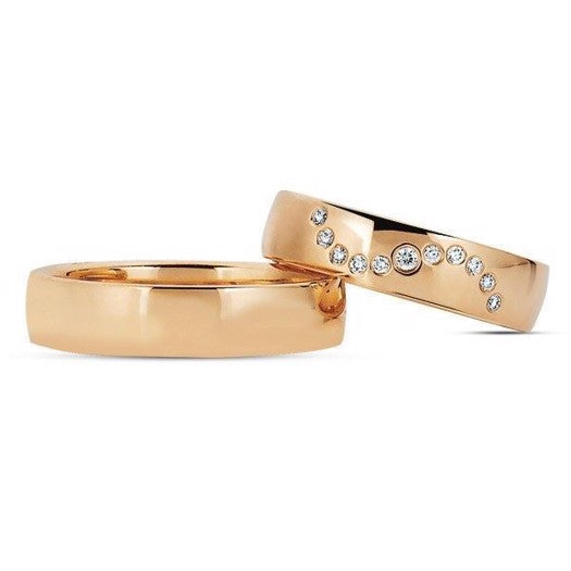 Nuran har gennem mange år markeret sig som et kvalitetsstempel i dansk smykkekunst, og det kommer tydeligt til udtryk i dette sæt vielsesringe. Dameringen prydes af i alt 11 funklende diamanter i forskellige størrelser – én på 0,02 ct. og ti på 0,01 ct. hver – alle i den smukke Wesselton/SV kvalitet, der sikrer et sofistikeret og strålende udtryk. Den varme rosa guldfarve tilfører et moderne twist til den klassiske vielsesring og fremhæver både hverdags- og festlooket med stil. Disse ringe er perfekte til par, der ønsker et varigt symbol på deres kærlighed, og passer til enhver anledning – fra bryllupsdagen til hverdagens små øjeblikke.