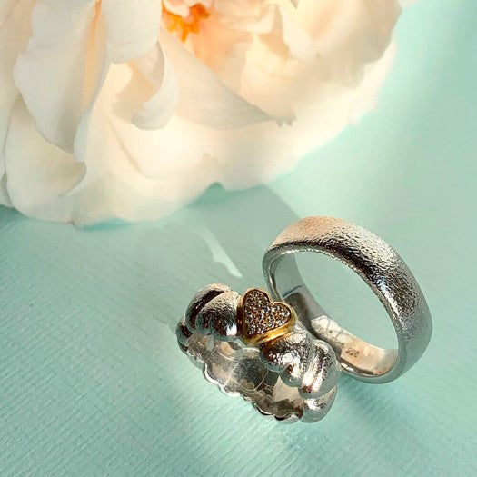 Med deres klassiske og organiske design taler disse vielsesringe til både tradition og individualitet. Dameringen imponerer med et bølgende, hjerteformet mønster, der elegant slynger sig henover fingeren. I centrum pryder en hjerteformet fatning i guld, smukt indfattet med 0,08 ct funklende diamanter, hvilket giver ringen et eksklusivt og personligt præg. Kombinationen af køligt hvidguld og varm guld giver et raffineret spil, der fremhæver både sten og form. Herreringen matcher stilen med sin enkle, men markante bølgede form – perfekt til manden, der ønsker en stilfuld og komfortabel vielsesring med maskulint udtryk.