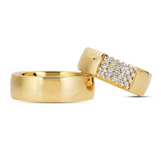 Disse vielsesringe er skabt af Nuran, som siden 1998 har forenet passion for design og traditionelt guldsmedehåndværk. Dameringen prydes af 15 smukke diamanter (0,45 ct. W/VS), der tilfører et luksuriøst og feminint udtryk, mens herreringen fremstår som et klassisk, bredt og neutralt bånd – enkelt og stilrent. Begge ringe er ideelle til indgravering af en personlig tekst, der gør dem unikke for netop jer. Perfekte til jer, der søger både kvalitet og et elegant, tidløst design, der vil bringe glæde og minder mange år frem.