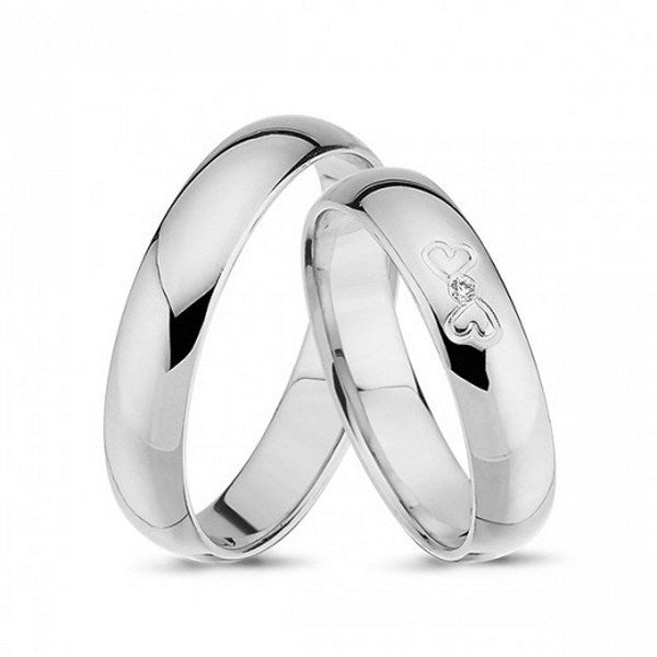 Smukke Nuran vielsesringe i 14 kt hvidguld med 0,01 ct diamant og to hjerter