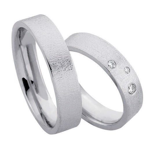 Sættet består af to stilrene ringe i rhodineret sølv, hvor dameringen er smukt prydet med tre brillantslebne diamanter i forskellige carat: 0,01, 0,02 og 0,04 ct. w/vs. Den forskudte placering af stenene giver et levende spil i lyset og skaber et eksklusivt, men diskret udtryk. Rhodineret sølv sikrer en ekstra blank overflade med dyb glans og effektiv beskyttelse mod ridser og misfarvning – så ringen holder sig smuk år efter år. Vielsesringene fra Nuran passer perfekt til par, der ønsker kvalitet og komfort samlet i et stilfuldt design, og det klassiske look gør dem velegnede til både hverdag og fest.